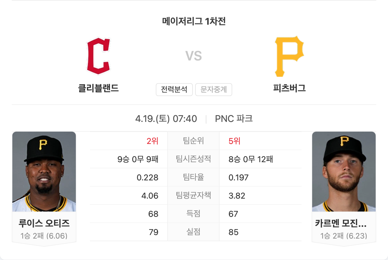 반면 파이리츠는 최근 들어 득점력이 살아나고 있으며, 불펜도 안정적인 운영을 보이고 있습니다. 홈에서는 큰 강세는 없지만 현재 분위기로 보면 약간의 우세를 점할 수 있는 흐름입니다.