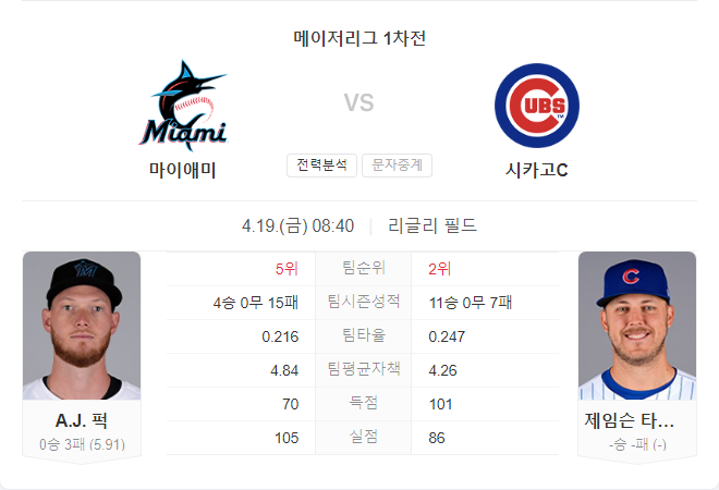 4월 19일 MLB 믈브 마이애미 말린스 VS 시카고 컵스 타카짱의 경기 예측 분석