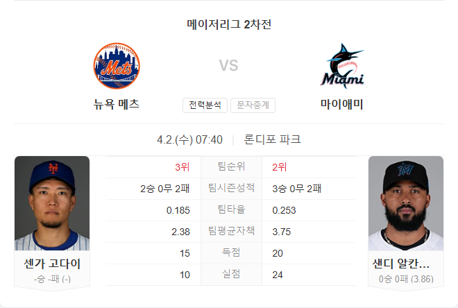 커리어 평균자책점 2.99와 171.2이닝에서 211탈삼진을 기록한 바 있어 기대를 모으고 있습니다. 타선에서는 시즌 초반 부진을 겪고 있지만, 전 경기에서 프란시스코 린도어와 피트 알론소가 멀티히트를 기록하며 팀 타율(.187) 반등의 신호를 보였습니다.