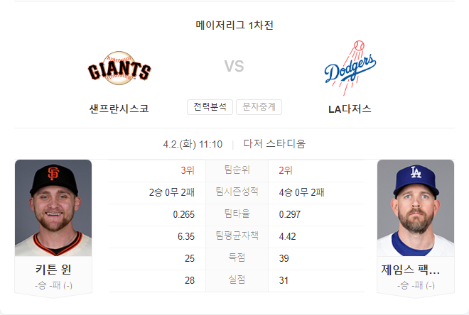 양 팀의 선발투수는 각각 시즌 첫 승리를 노리며 마운드에 오르게 되며, 다저스의 강력한 타선과 자이언츠의 반등을 노리는 타선이 치열한 접전을 펼칠 것으로 예상된다. 다저스가 홈에서의 강점을 살려 경기를 주도할 가능성이 높으나, 자이언츠도 만만치 않은 반격을 준비하고 있어 흥미로운 경기가 될 것으로 전망된다.