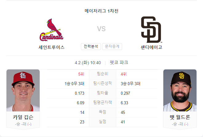 카디널스와 파드레스의 이번 경기는 양 팀 모두에게 중요한 시리즈의 시작이 될 것이다. 카디널스는 새로운 팀원 깁슨의 활약을 기대하며 반등을 노리고 있고, 파드레스는 홈에서의 강점을 살려 시즌 초반 좋은 분위기를 이어가려 한다.