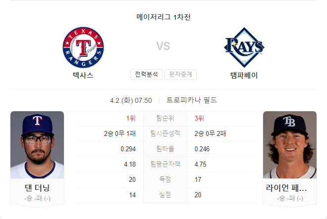 4월 2일 MLB 믈브 텍사스 레인저스 VS 템파베이 레이스 경기 예측