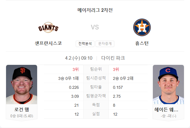 자이언츠는 투타 밸런스를 바탕으로 안정적인 시즌 출발을 보이고 있으며, 휴스턴을 상대로도 상성이 좋은 편입니다. 반면 애스트로스는 타선이 아직 침묵하고 있으며, 선발 웨스네스키의 자이언츠 상대 약세도 부담 요소입니다. 휴스턴이 투수진에서 강세를 보이고 있지만, 공격에서 부족한 점을 감안할 때 접전 끝에 자이언츠가 우위를 점할 가능성이 높아 보입니다.