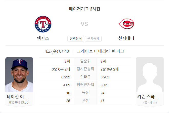 4월 2일 MLB 텍사스 레인저스 VS 신시내티 레즈 타카짱의 경기 예측 분석