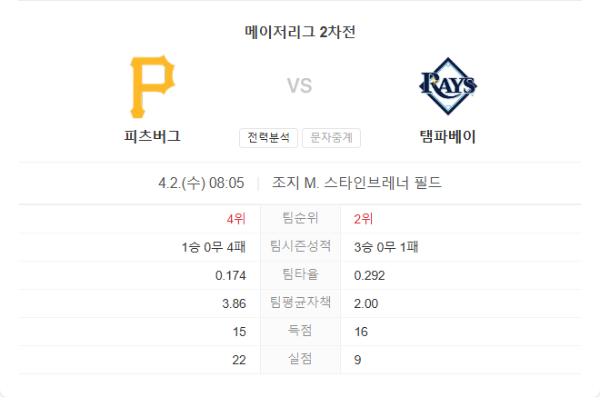 파이리츠는 접전 양상 속에서도 번번이 마무리에 실패하며 연패를 안았고, 타선의 낮은 생산력이 발목을 잡고 있습니다. 이에 반해 레이스는 안정적인 선발진과 탄탄한 불펜, 장타력을 바탕으로 흐름을 이어가고 있습니다.