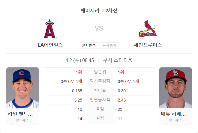 에인절스는 개막 시리즈에서 화이트삭스를 상대로 2승 1패를 기록하며 시즌을 시작했습니다. 일요일에는 비로 인해 지연된 경기에서 3-2로 승리하며 시리즈를 가져갔습니다. 현재 2연승을 달리고 있으며, 타선과 마운드 모두 안정적인 경기력을 보여주고 있습니다. 선발로 나서는 카일 헨드릭스는 올해 에인절스에서의 첫 시즌을 맞이합니다.