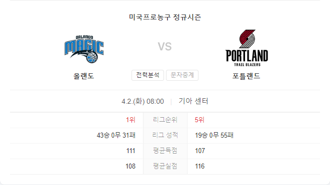 4월 2일 NBA 포틀랜드 트레일블레이저스 VS 올랜도 매직 경기 예측