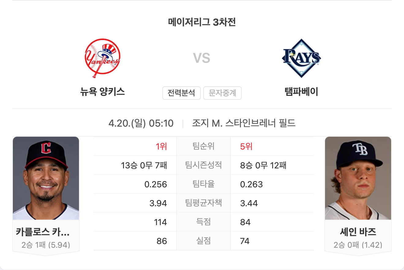 양키스는 마운드와 타선 모두 리그 상위권 수준을 유지하고 있으며, 원정에서도 강한 경기력을 자랑하고 있습니다. 최근의 압도적인 흐름은 탬파베이를 상대로도 유지될 가능성이 큽니다.