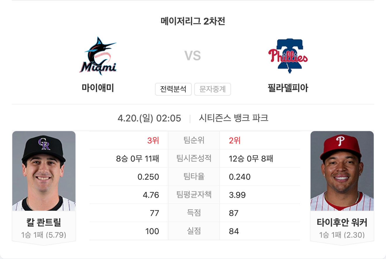 말린스는 마운드와 타선 모두에서 약점을 보이고 있으며, 원정에서도 반등할 기미가 보이지 않고 있습니다. 경기 후반 집중력도 떨어져 승리 가능성이 낮은 흐름입니다.