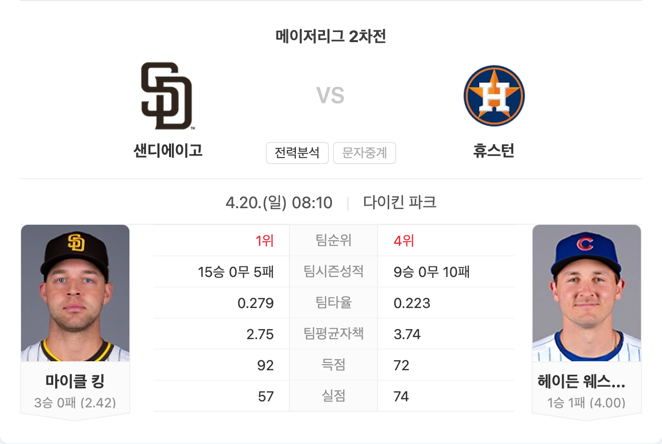 반면 애스트로스는 투타의 조화를 바탕으로 안정된 경기 운영이 가능하며, 최근 홈 경기에서 강한 모습을 유지하고 있습니다. 전체적인 흐름과 지표 모두에서 우위에 있는 팀입니다.