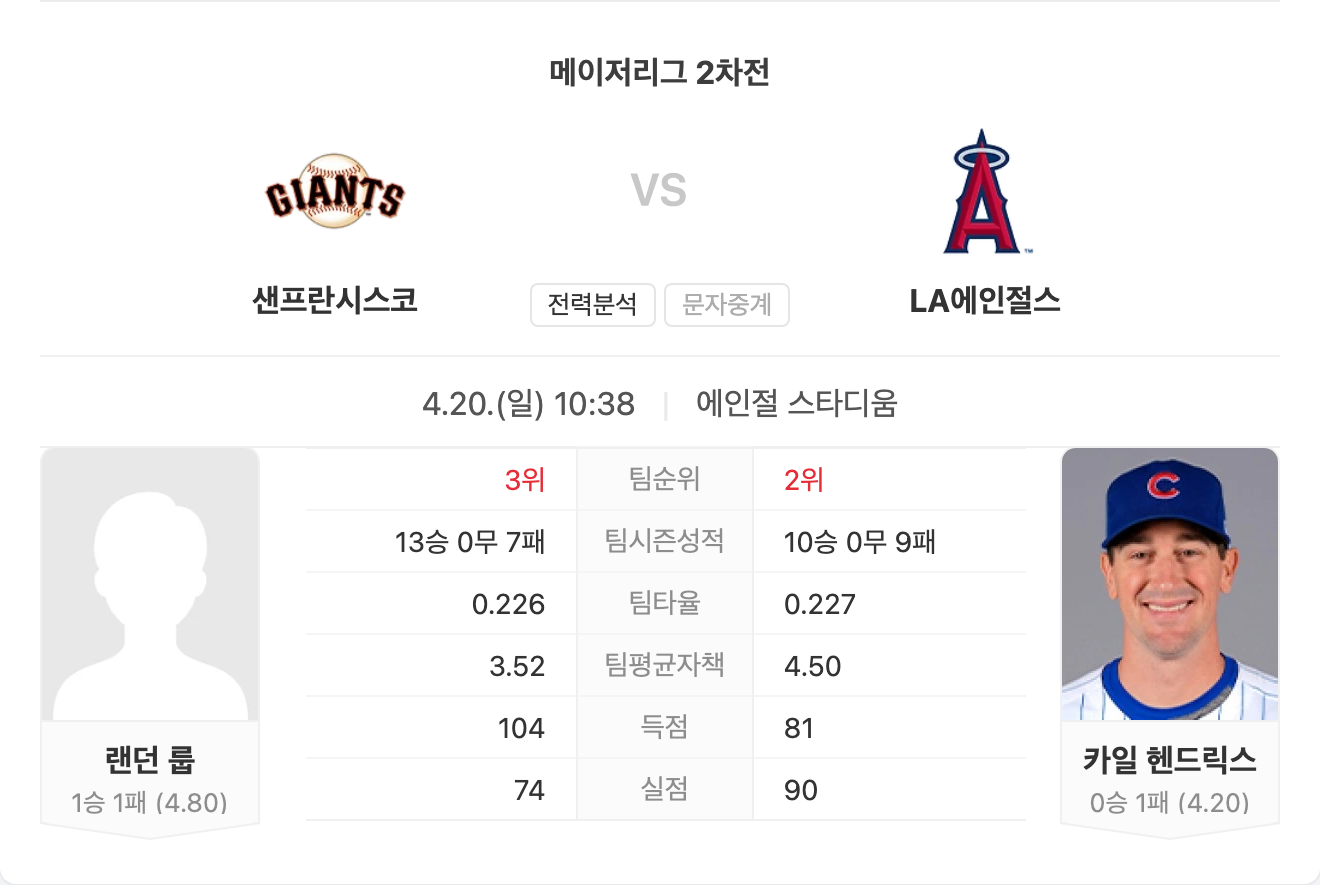 4월 20일 MLB 메이저리그 샌프란시스코 자이언츠 VS LA 에인절스 타카짱의 경기 예측 분석