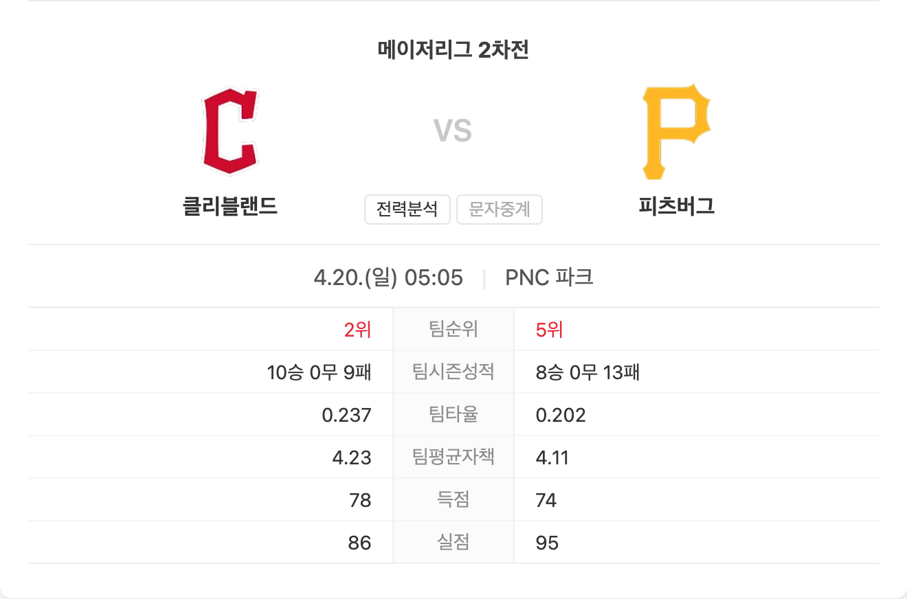 4월 20일 MLB 메이저리그 클리블랜드 가디언스 VS 피츠버그 파이어리츠 타카짱의 경기 예측 분석