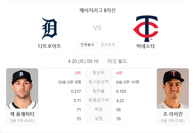 미네소타 트윈스는 올 시즌 부진한 성적을 보이고 있으며, 주요 선수들의 부상도 팀 성적에 영향을 미치고 있습니다. 조 라이언이 이번 경기의 선발 투수로 나서며, 그는 올 시즌 2.60의 평균자책점을 기록하고 있습니다. 미네소타는 이번 홈 경기에서 반등을 노립니다.