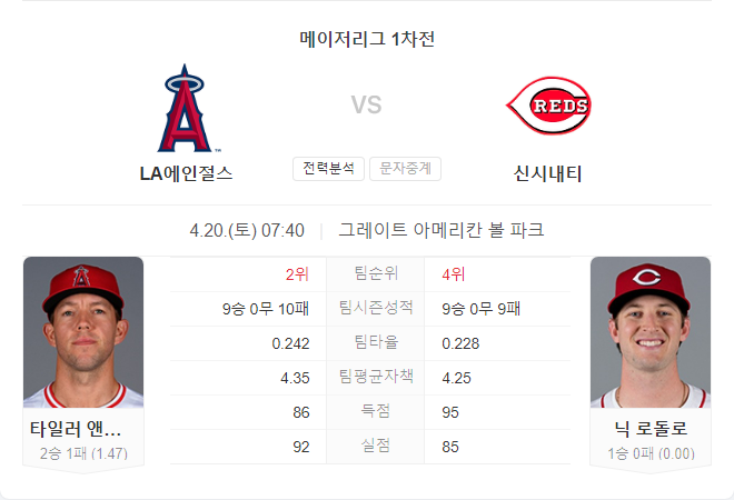 두 팀 모두 최근 일정이 다소 험난했으며, 특히 에인절스는 장기 원정 일정 동안 투수진이 약점을 드러내고 있습니다. 반면, 로돌로는 올 시즌 첫 등판에서 강력한 모습을 보여주었고, 신시내티의 홈에서의 강점을 바탕으로 이번 경기에서도 좋은 성적을 기대할 수 있습니다.