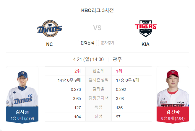 4월 21일 KBO 프로야구 NC 다이노스 VS 기아 타이거즈 타카짱의 경기 예측 분석