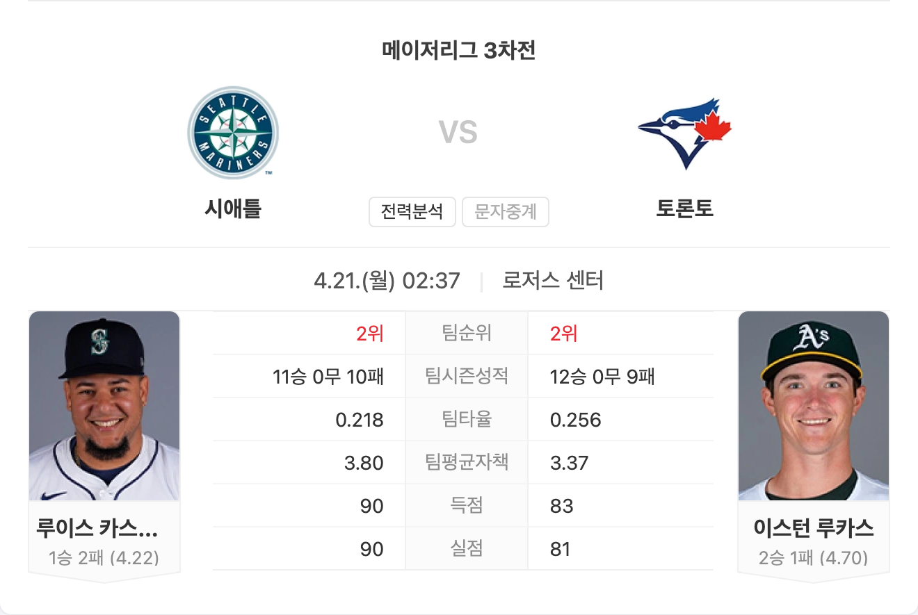 반면 블루제이스는 최근 마운드와 타선 모두에서 불안정한 흐름을 보이고 있으며, 홈에서도 뚜렷한 강점을 보이지 못하고 있습니다. 전체적인 전력과 최근 경기력 모두 매리너스가 앞서 있습니다.