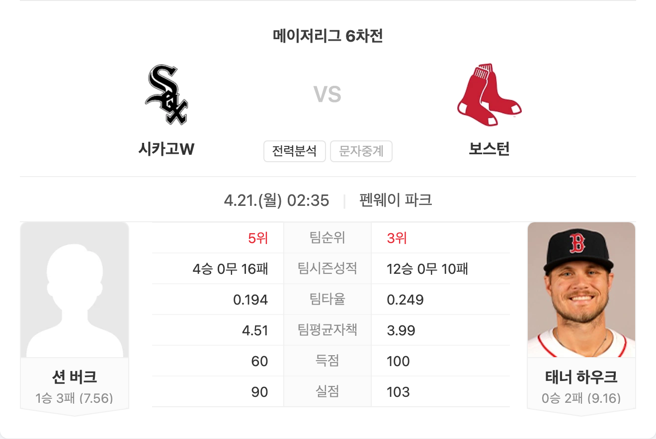 레드삭스는 안정적인 마운드 운영과 효율적인 타선 구성으로 최근 강세를 보이고 있으며, 홈에서는 특히 강한 경기력을 보여주고 있습니다. 두 팀의 전력과 분위기를 고려할 때 레드삭스가 확실한 우위를 점하고 있습니다.