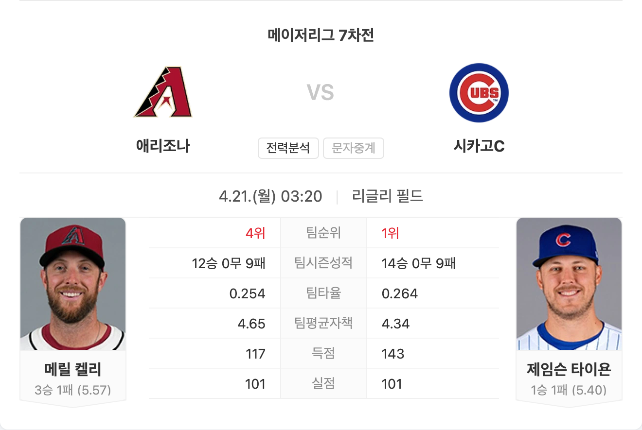 4월 21일 MLB 메이저리그 애리조나 다이아몬드백스 VS 시카고 컵스 타카짱의 경기 예측 분석