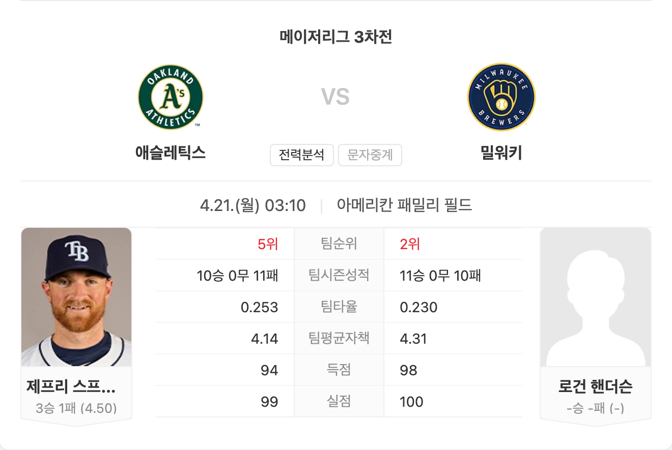 반면 브루어스는 전반적인 전력에서 에슬레틱스를 상회하고 있으며, 최근 흐름과 홈에서의 강세를 바탕으로 안정적인 경기 운영이 가능합니다. 브루어스가 우세한 흐름을 이어갈 가능성이 높습니다.