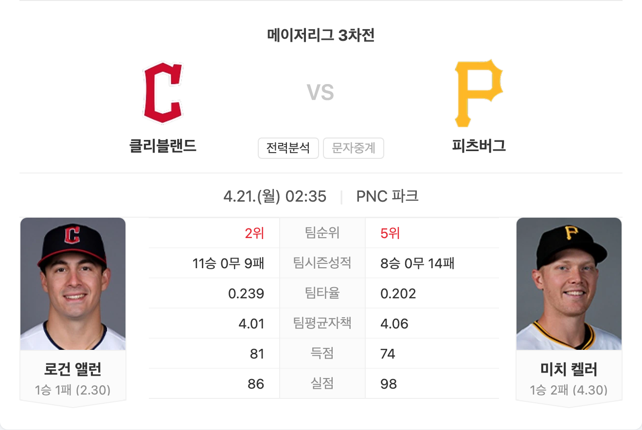 파이리츠는 마운드에서 평균적인 경기력을 유지하고 있고, 홈에서 경기력이 나쁘지 않지만, 불펜에서의 기복과 타선의 기세 면에서 가디언스보다 다소 밀리는 모습입니다. 전체적으로는 가디언스가 근소하게 앞선 경기입니다.