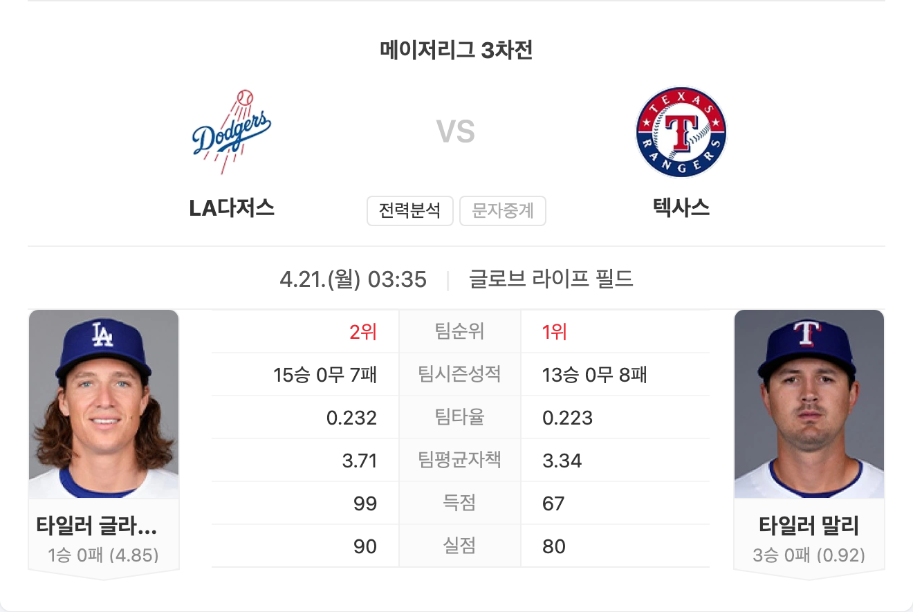 반면 레인저스는 공격력은 나쁘지 않지만 마운드에서의 기복과 불펜 불안이 지속되고 있으며, 홈에서도 뚜렷한 우위를 점하지 못하고 있습니다. 전력과 흐름 모두에서 다저스가 확실히 앞서 있습니다.