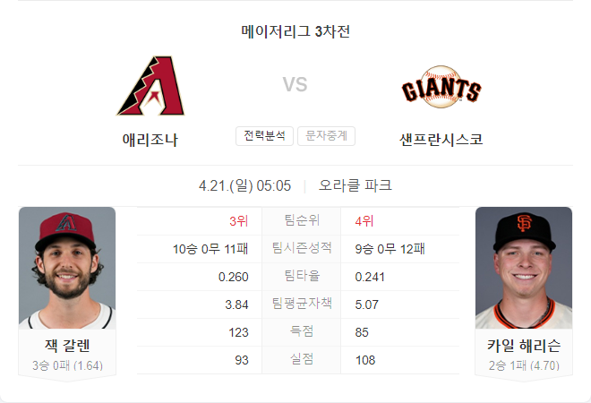 | 4월 20일 MLB 믈브 애리조나 다이아몬드백스 VS 샌프란시스코 자이언츠 타카짱의 경기 예측 분석 (0) | 2024.04.19 |