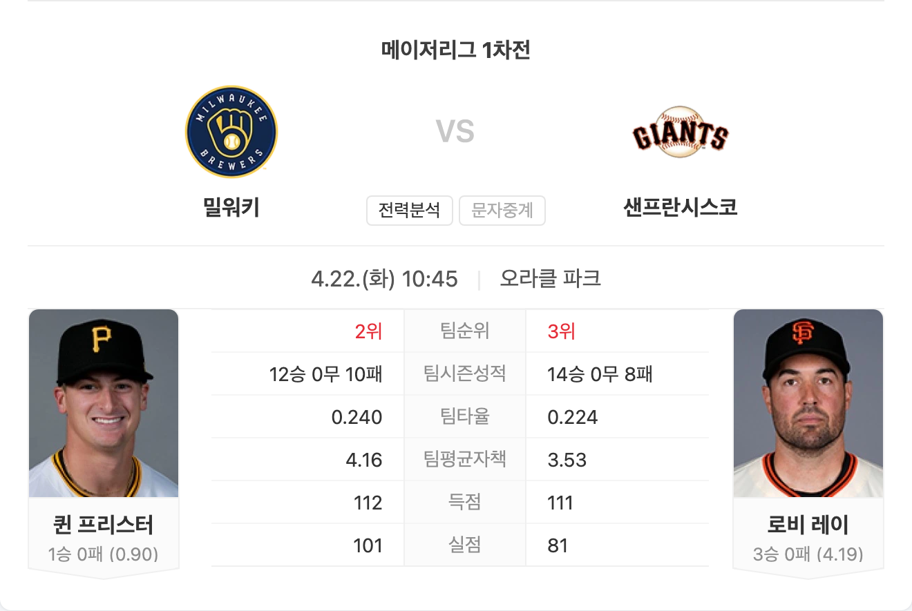 4월 22일 MLB 메이저리그 밀워키 브루어스 VS 샌프란시스코 자이언츠 타카짱의 경기 예측 분석