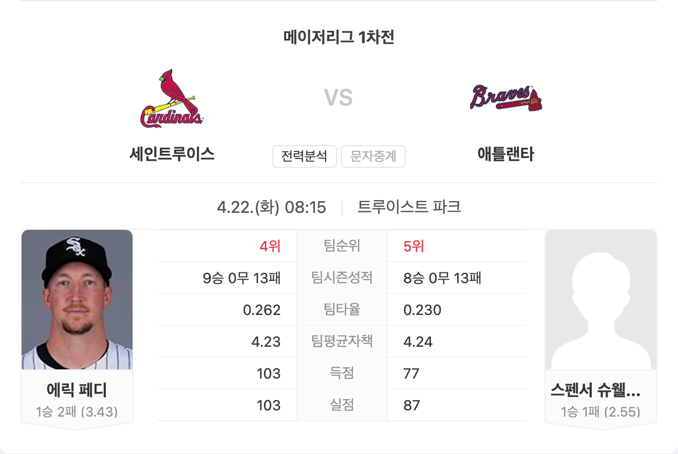 반면 브레이브스는 리그 최강 타선을 기반으로 마운드 역시 안정된 운영을 보이며, 홈에서는 거의 틈이 보이지 않는 강세를 유지하고 있습니다. 전체적인 전력 격차가 상당한 경기입니다.
