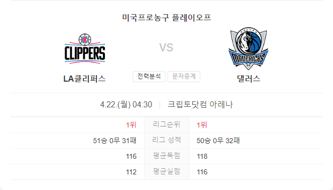 4월 22일 NBA 달라스 매버릭스 VS LA 클리퍼스 타카짱의 경기 예측 분석