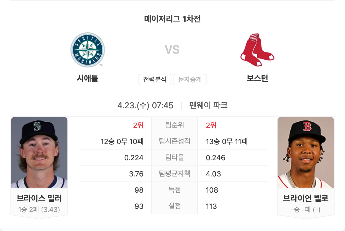 레드삭스는 홈에서 타선이 폭발력을 보여주고 있으며, 마운드도 실점 억제에서 효율적인 모습을 보이고 있습니다. 두 팀의 전력을 비교했을 때, 전체적인 밸런스와 흐름 면에서 보스턴이 우위입니다.