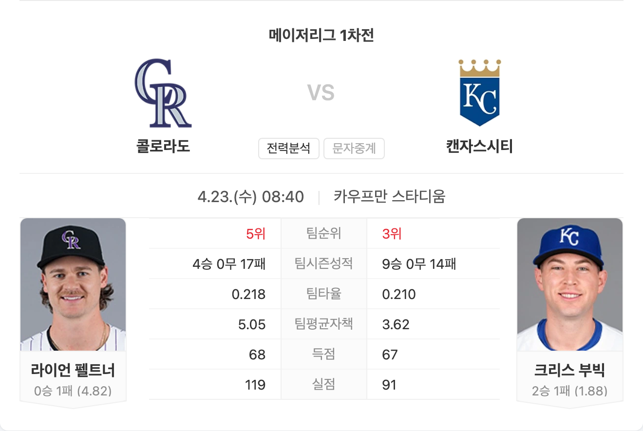 반면 로열스는 리그 최고 수준의 마운드를 바탕으로 실점을 억제하고 있으며, 홈에서의 강한 경기력이 뒷받침되고 있습니다. 투타 밸런스와 최근 흐름 모두 로열스가 확실한 우위를 점합니다.