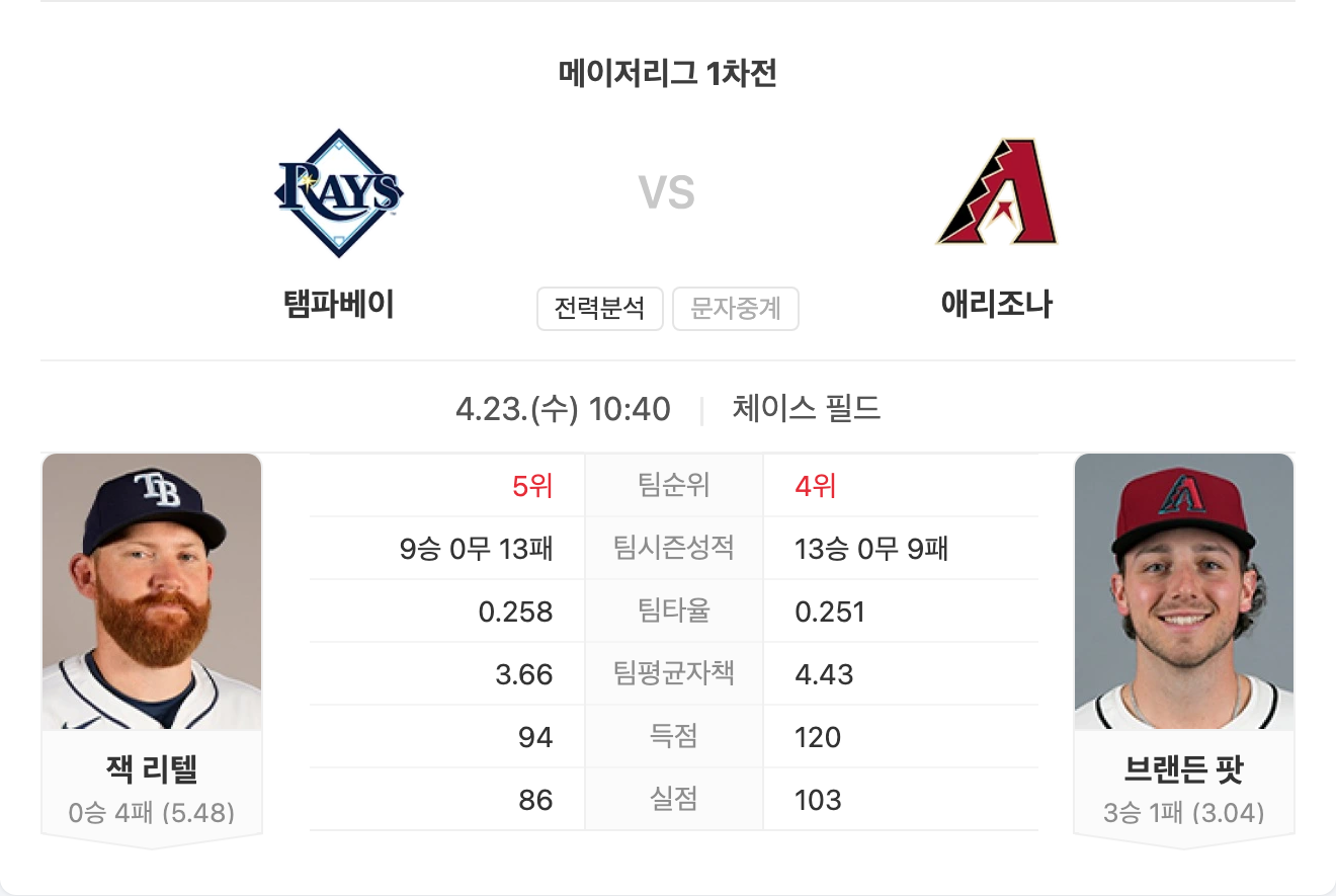 4월 23일 MLB 메이저리그 탬파베이 레이스 VS 애리조나 다이아몬드백스 타카짱의 경기 예측 분석