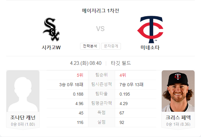 두 팀 모두 시즌 초반 좋지 않은 성적을 거두고 있으며, 타선의 침체가 두드러지고 있습니다. 특히 미네소타는 팀 타율이 .194로 매우 저조하며, 시카고 또한 많은 경기에서 저점수에 그치고 있습니다.