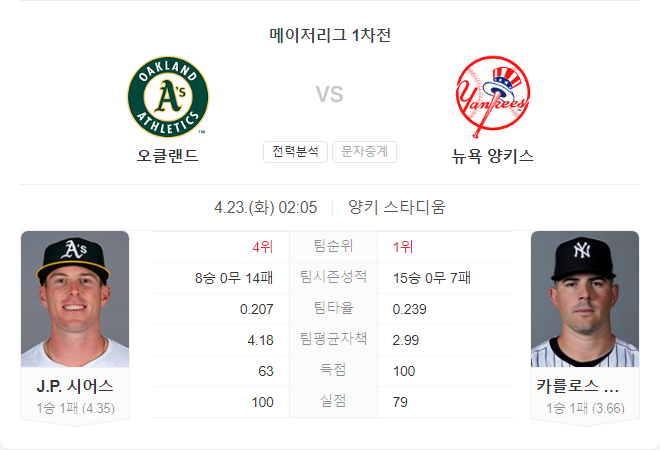 반면, 오클랜드는 타선에서 큰 힘을 발휘하지 못하고 있으며, 특히 좌투수를 상대로 약한 모습을 보이고 있습니다. 따라서 뉴욕 양키스가 이번 경기에서 우위를 점할 것으로 보이며, 양키스의 승리를 예상합니다.