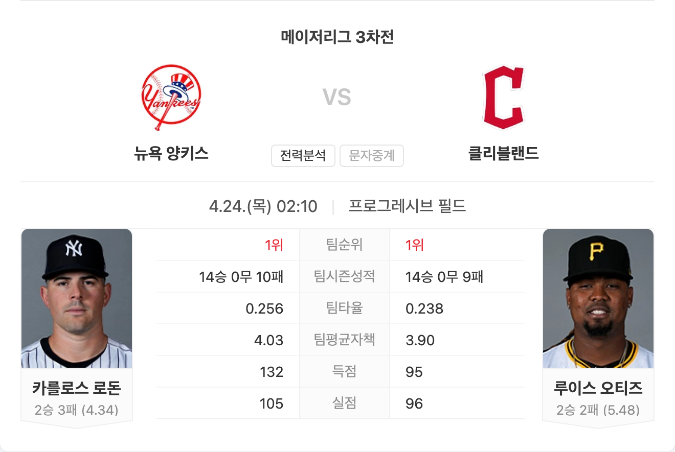 양키스는 마운드와 타선 모두 리그 최정상급 전력을 유지하고 있으며, 원정에서도 매우 강한 흐름을 보이고 있습니다. 최근 상승세가 이어지고 있는 점도 긍정적입니다.