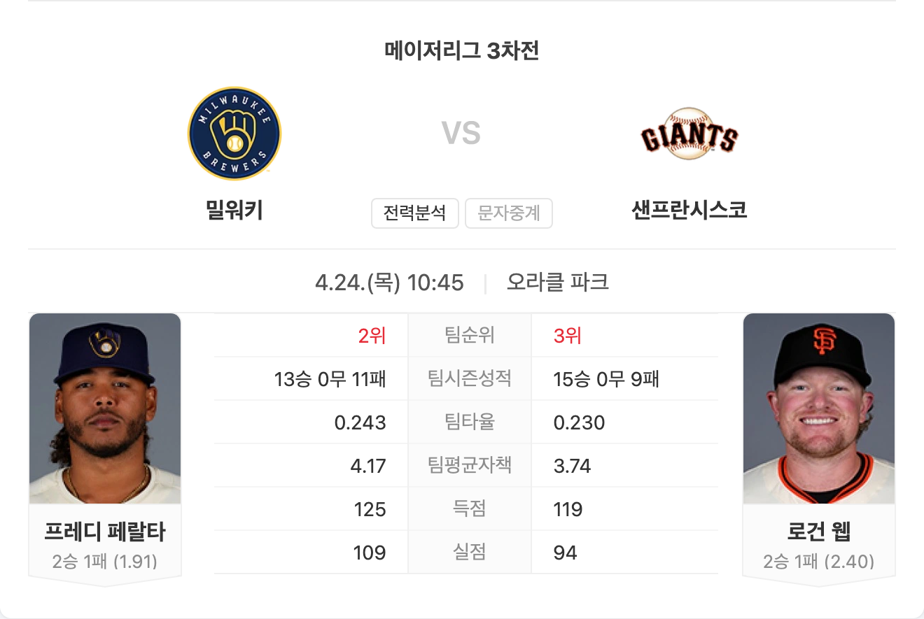 자이언츠는 홈에서 나쁘지 않은 경기력을 보이지만 마운드의 기복과 하위 타선의 약점이 발목을 잡고 있습니다. 전체적인 전력과 최근 흐름을 고려할 때 브루어스가 유리한 경기입니다.