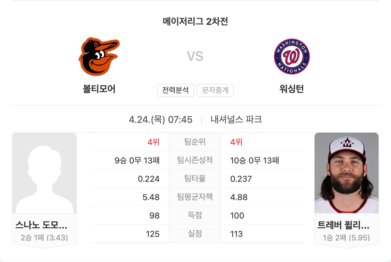 내셔널스는 마운드와 타선 모두 리그 하위권 수준이며, 수비에서도 경기 흐름을 깨는 실수가 나오는 경우가 많습니다. 전반적인 전력과 흐름을 비교했을 때 오리올스가 확실한 우위를 점합니다.