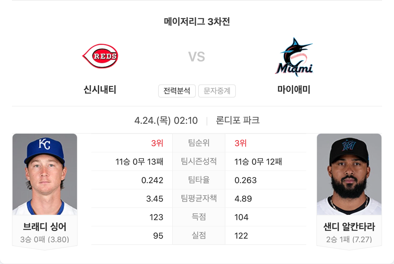 말린스는 마운드와 타선 모두 리그 하위권에 머무르며 연패에 가까운 흐름을 이어가고 있습니다. 수비 집중력도 떨어져 경기를 스스로 무너뜨리는 장면이 많습니다. 전체적인 전력에서 레즈가 우세합니다.