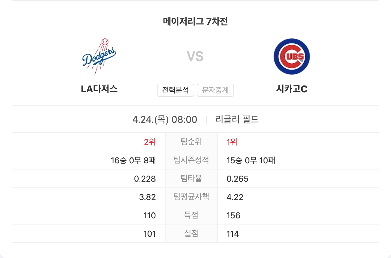 컵스는 홈에서 강한 경기력을 보이고 있지만, 전반적인 전력과 흐름에서는 다저스에 비해 열세입니다. 다저스가 선발과 불펜, 타선까지 전방위에서 우위를 점하는 만큼 승리 가능성이 높아 보입니다.