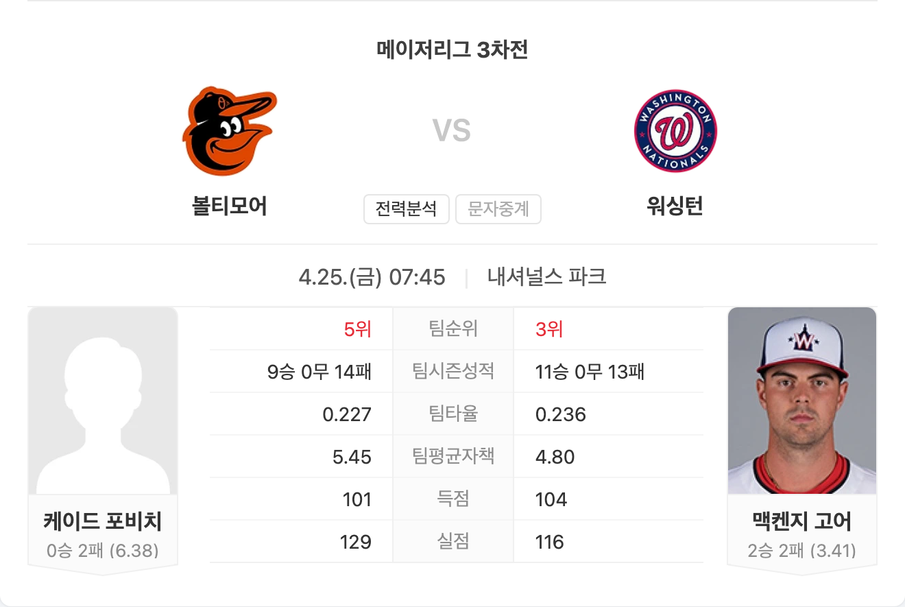 반면 내셔널스는 마운드의 기복과 타선의 한계로 인해 강팀과의 맞대결에서 우위를 점하기 어렵습니다. 전체적인 흐름과 전력에서 오리올스가 압도적으로 앞선다고 볼 수 있습니다.