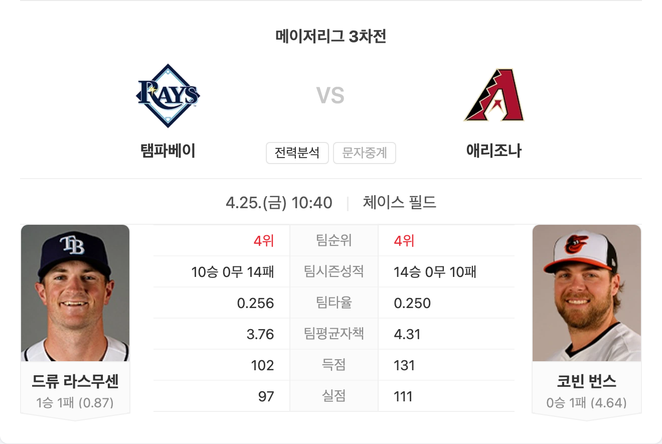 | 4월 25일 MLB 메이저리그 텍사스 레인저스 VS 에슬레틱스 타카짱의 경기 예측 분석 (0) | 2025.04.25 |