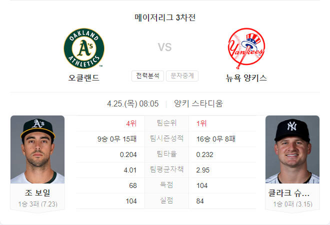 오클랜드 어슬레틱스는 이번 시리즈의 개막전에서 2-0으로 승리하며 좋은 출발을 보였습니다. 이번 경기에서는 조 보일이 선발 투수로 나서며, 올 시즌 가장 좋았던 성적을 거둔 원정 경기에서의 경험을 살려 팀을 이끌 예정입니다. 하지만, 그의 다른 세 경기에서는 13.2이닝 동안 16실점을 허용하는 등 부진한 모습을 보였습니다.