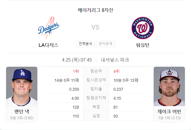 내셔널스 파크에서 열리는 이 경기에서는 워싱턴이 홈 이점을 살려 다저스를 상대로 좋은 경기를 펼칠 것으로 보입니다. 다만, 다저스의 강력한 타선도 언제든지 경기의 흐름을 바꿀 수 있으므로 접전이 예상됩니다.