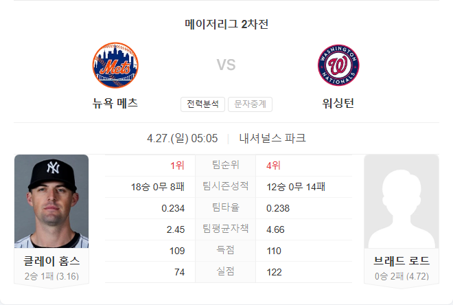 워싱턴 내셔널스는 상승세를 타긴 했지만, 선발진과 불펜 모두 뉴욕 메츠에 비해 열세에 있습니다. 경기 초반부터 주도권을 내줄 가능성이 높습니다.