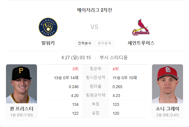 4월 27일 MLB 메이저리그 밀워키 브루어스 VS 세인트루이스 카디널스 타카짱의 경기 예측 분석