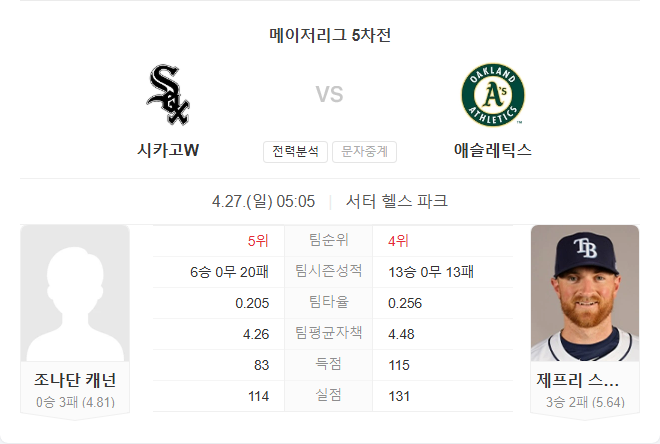 4월 27일 MLB 메이저리그 시카고 화이트삭스 VS 애슬레틱스 타카짱의 경기 예측 분석