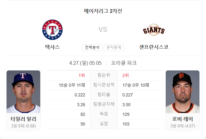 4월 27일 MLB 메이저리그 텍사스 레인저스 VS 샌프란시스코 자이언츠 타카짱의 경기 예측 분석