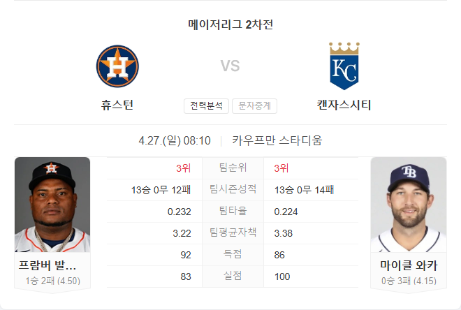 휴스턴 애스트로스는 투수진의 안정감이 돋보이며, 프람버 발데스도 최근 들어 점차 안정을 찾아가고 있습니다. 타선은 아직 살아나지 않았지만, 로열스 투수진 상대로 충분히 득점 기회를 잡을 수 있을 전망입니다.
