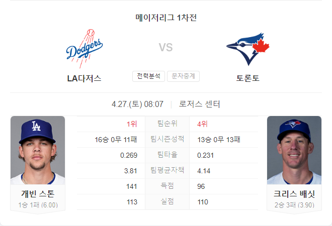 4월 27일 MLB LA 다저스 VS 토론토 블루제이스 타카짱의 경기 예측 분석