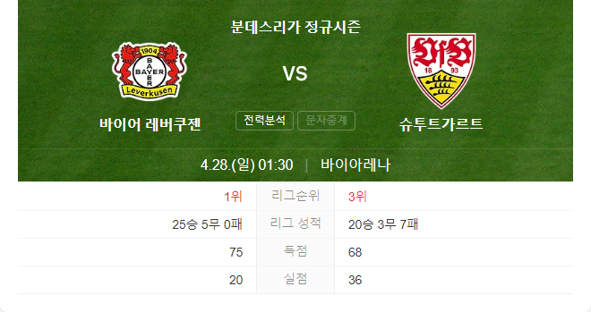 레버쿠젠은 현재 독일 1부 리그에서 1위를 차지하고 있으며, 최근 경기 성적은 승승승무무로 무패 행진을 이어가고 있습니다. 특히 슈투트가르트를 상대로는 좋은 전적을 가지고 있지만, 주요 미드필더 자카의 결장으로 인해 빌드업과 전환 패스에 어려움을 겪을 수 있습니다.